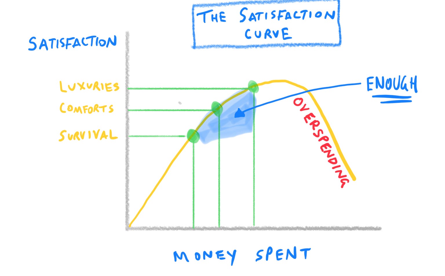 Money is the exact same way. If we just set out to accumulate money in our lives and only spend it on ourselves, it often leads to diminishing satisfaction via overspending (see Satisfaction Curve above).