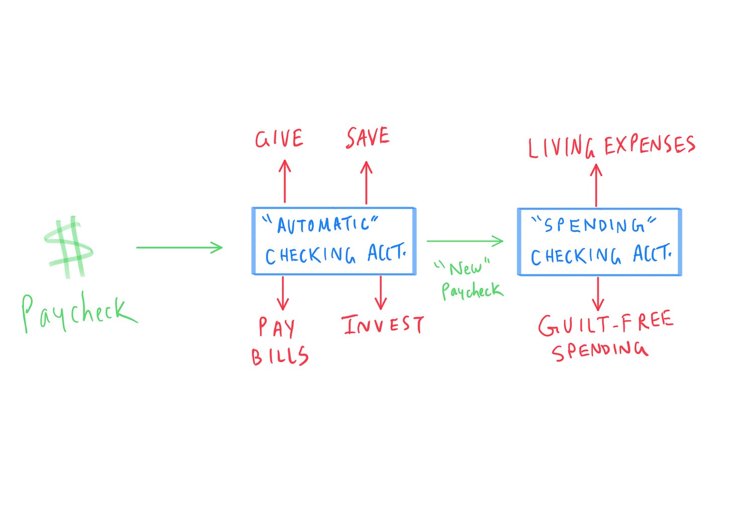 All your money flows into the "Automatic" checking account. Big, important things like giving, saving, investing, and paying recurring bills automatically get done right from there. Then, with what's leftover, a "new" paycheck is transferred to the "Spending" checking account. All the money in this second checking account can be spent guilt-free on things like groceries, eating out, clothes, gas, and entertainment.
