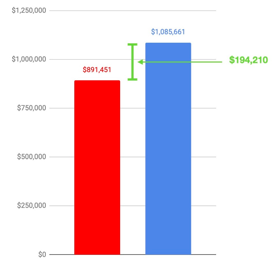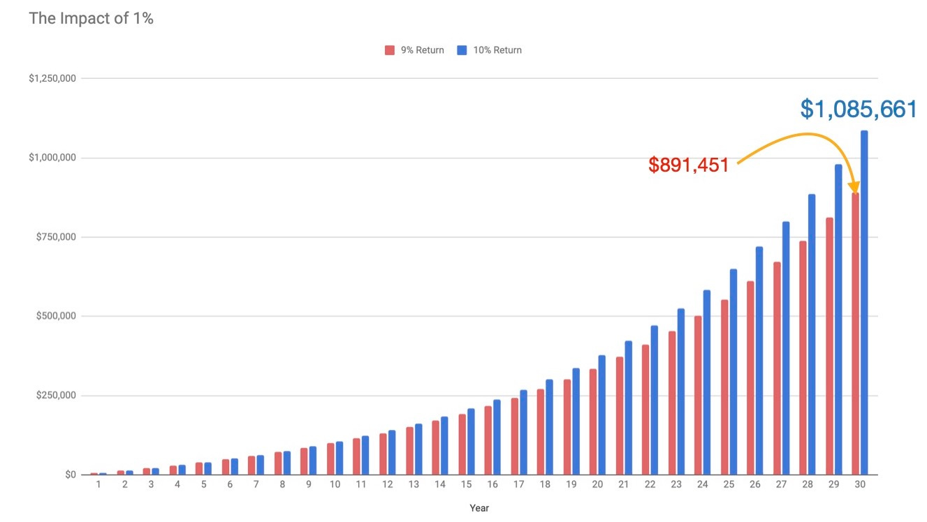 For fun, let me show you the massive impact of a 1% fee. 1%. Doesn’t seem like much, right? I mean, what difference could a measly 1% make?